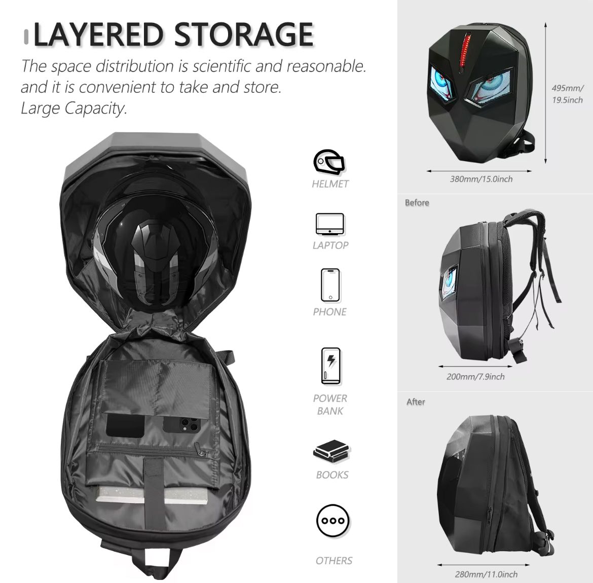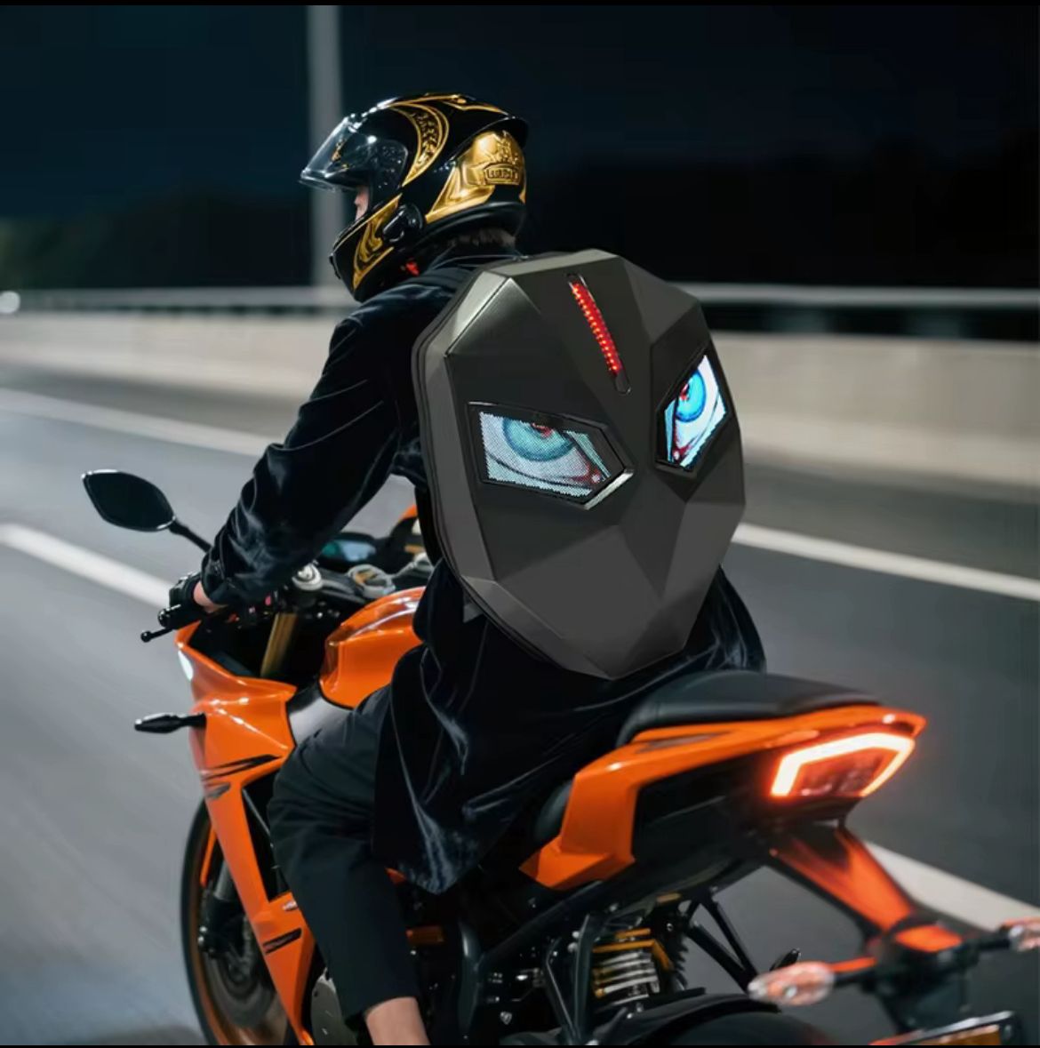 Search Keywords (SEO): programmable LED motorcycle backpack NZ, Moto Knight biker bag, LED eyes motorcycle backpack New Zealand, LED display riding bag, waterproof motorcycle backpack NZ, futuristic LED motorbike backpack, hard shell LED backpack NZ.