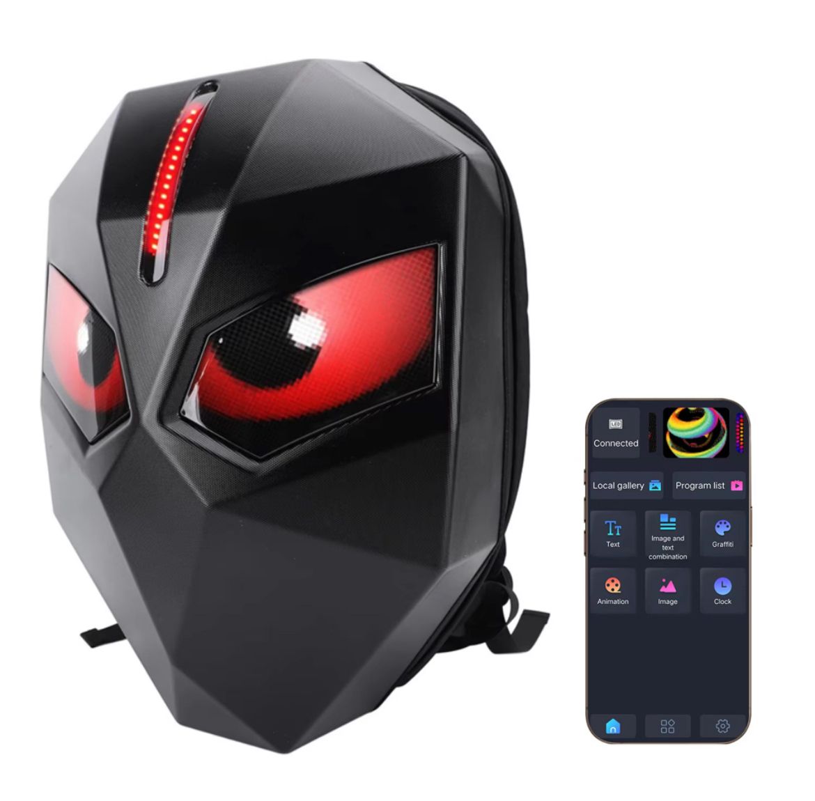 Stand out on the road with the Programmable LED Men Moto Knight Biker Bag, the ultimate motorcycle backpack for riders in New Zealand. Designed with advanced technology and safety in mind, this modern LED motorcycle backpack features programmable LED eyes and display screen that can be customised through a mobile app to show text, animations, or images. Perfect for night rides, bike events, and daily commuting, this backpack combines functionality with a bold futuristic design.